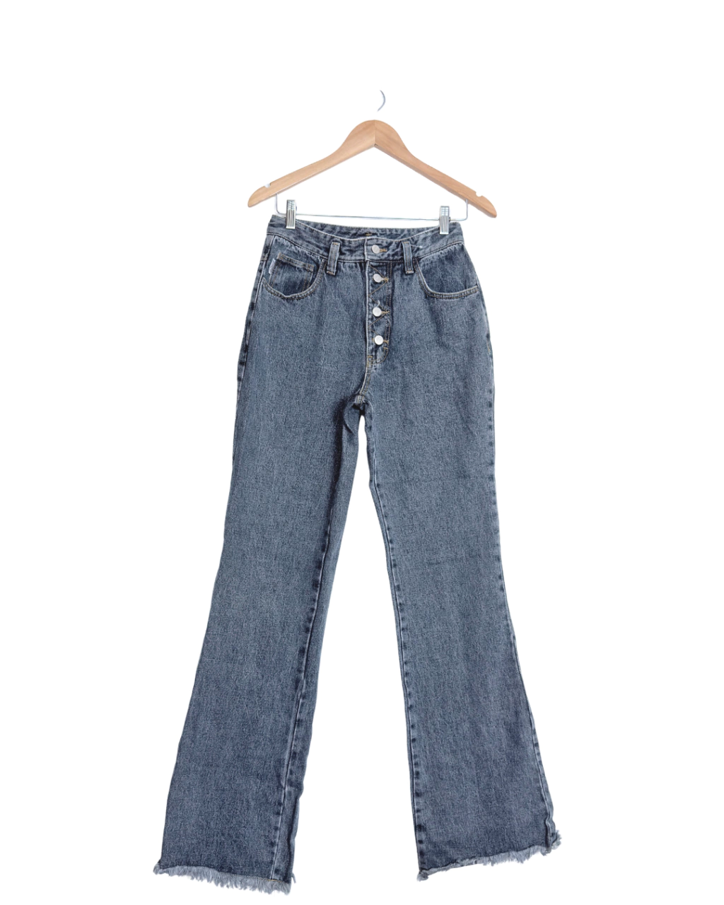 Calça jeans feminina flare em lavagem cinza escuro. Cintura alta com fechamento por botões aparentes. Barra desfiada. Estilo retrô anos 70 e moderno.